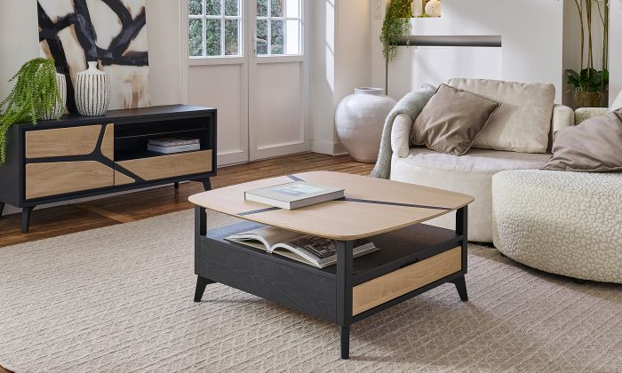 Structure panneau de particules de 19mm avec placage chêne naturel/ eucalyptus 1mm. Pieds bois massif chêne 21mm.
